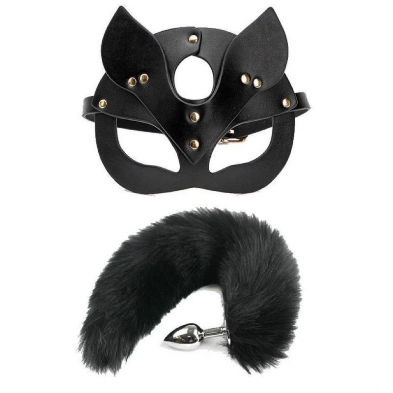 Пробка с черным хвостом + маска кошечки "Vandersex" металл, S